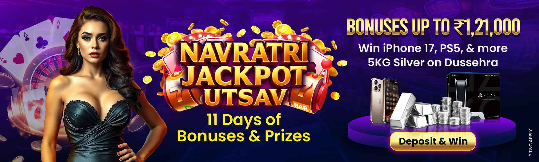Get ready for 11 days of non-stop festive thrill with the Navratri Jackpot Utsav! From 22nd Sept to 2nd Oct 2025, claim bonuses up to ₹121,000 and stand a chance to win amazing prizes like the iPhone 17, PS5, Samsung 75” TV, Apple Ultra Watch 3, GoPro Hero13, Xbox Series S, and more! And on Dussehra Day, make a grand deposit for a shot at the ultimate prize, a massive 5KG Silver! Don’t miss this festive celebration of bonuses and jackpots!